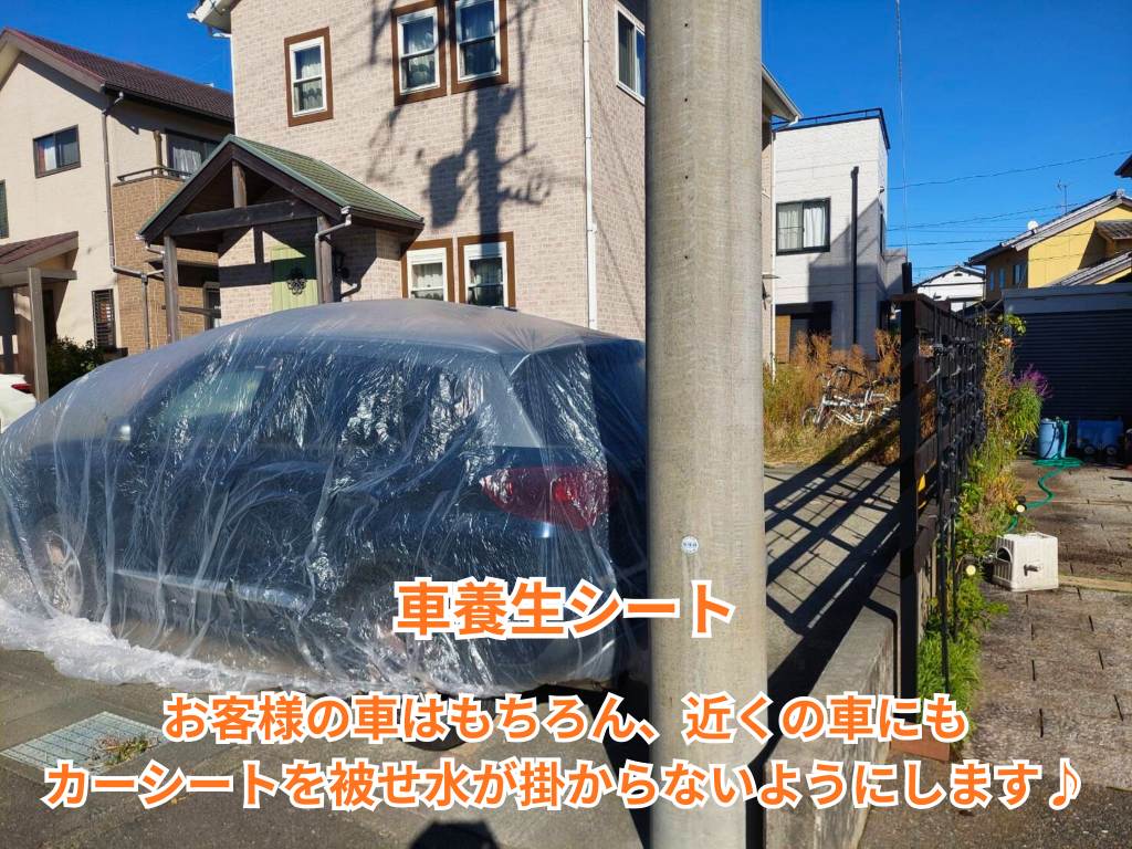現場に到着すると、まずは周囲への配慮からスタートします。洗浄水が隣家に飛ばないように養生シートを丁寧に張り、周辺の車や植物にも水がかからないよう確認します。この準備をどれだけ丁寧にできるかで、作業のスムーズさが大きく変わります。