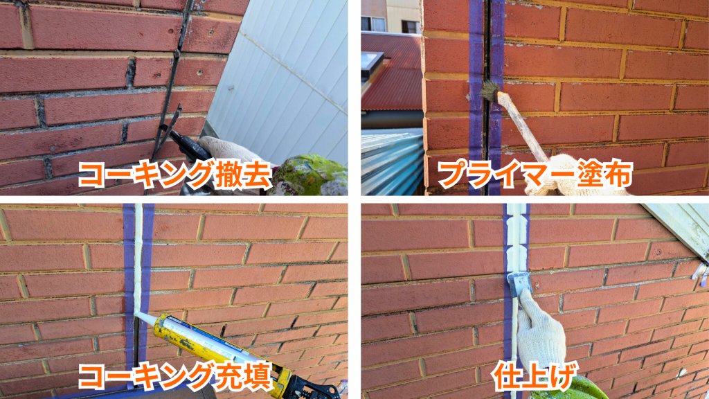 次にマスキングテープで養生を行い、仕上がりのラインをキレイに整えます。その後、プライマーを塗布して密着性を高めます。下準備が整ったら、新しいコーキングを充填していきます。目地の奥までしっかりと材料を入れ込み、ヘラで押さえて表面を整えれば完了です。