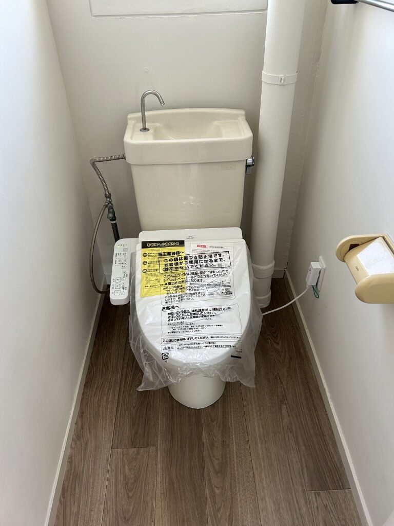 マンションリノベーション トイレリフォームを行いました。施工内容は、トイレ交換、天井壁クロス貼替、床クッションフロアー貼替、建具交換、照明交換、棚撤去、紙巻器交換、タオル掛け交換等を行いました。新築みたいになりました。
