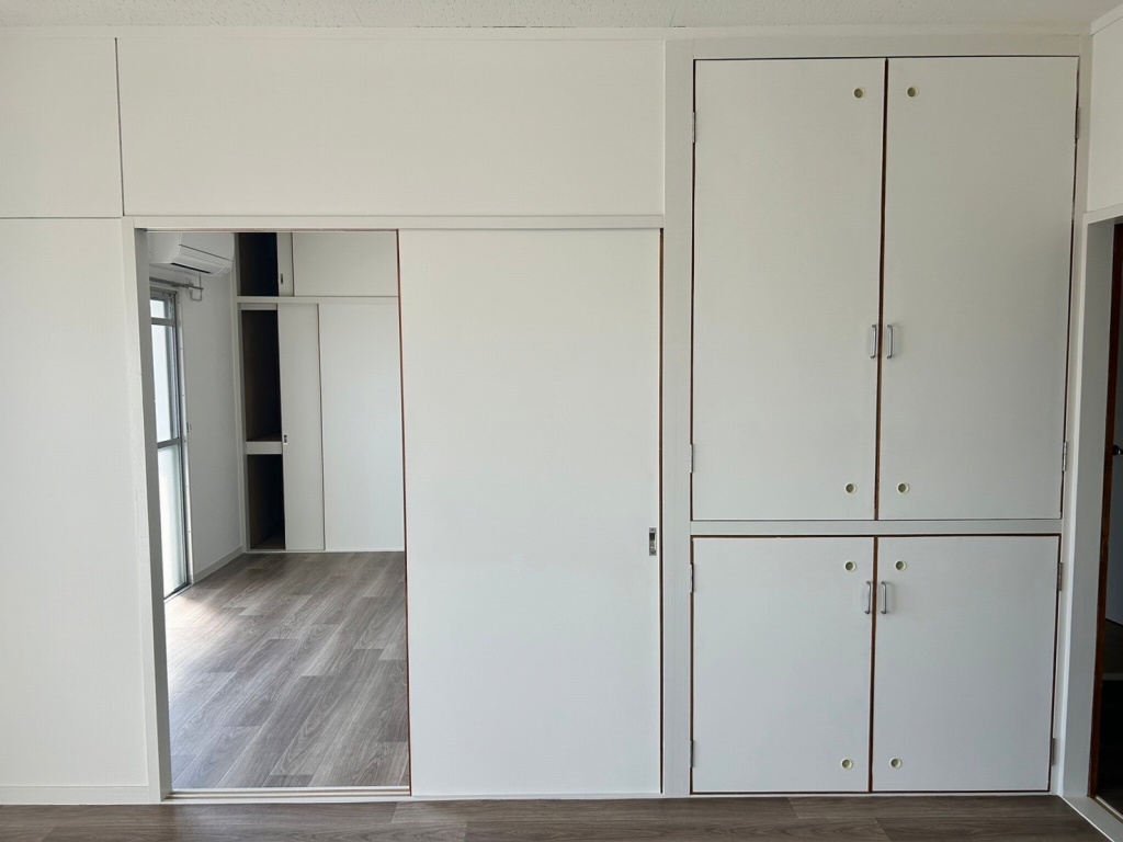 マンションリノベーション工事 LDKリフォームを行いました。施工内容は、キッチン交換、天井壁クロス貼替、床フロアータイル貼り、クローゼット撤去、照明交換、スイッチ、コンセント交換等を行いました。LDKがかなり広くなり、新築みたいにキレイになりました。