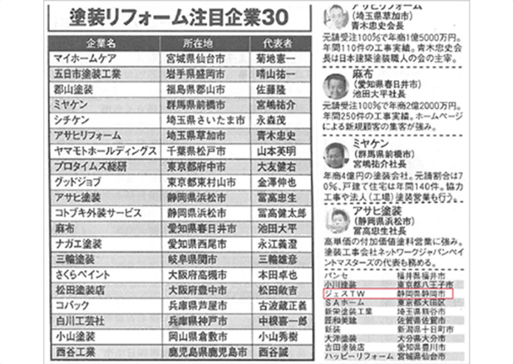 メディア・表彰実績塗装リフォーム注目企業30に愛情ペイントが載りました塗装リフォーム注目企業30に愛情ペイントが載りましたリフォーム産業新聞の塗装リフォーム注目企業30に私達愛情ペイントが載りました。無料お見積はこちら