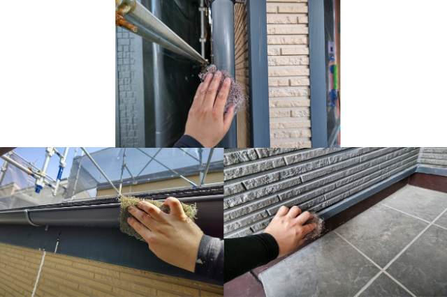 足場も組み終わり、まず最初に高圧洗浄を行います。外壁や屋根の塗装面にこびりついた汚れやカビ、チョーキング(外壁等を触ると手に付く白い粉の現象)を高圧の水流によって洗い落としていきます。何故、高圧洗浄を行うかと言いますとお化粧の前の洗顔と同じで、表面の汚れを落とし、サッパリとしてから塗料を手塗りで塗っていきます。