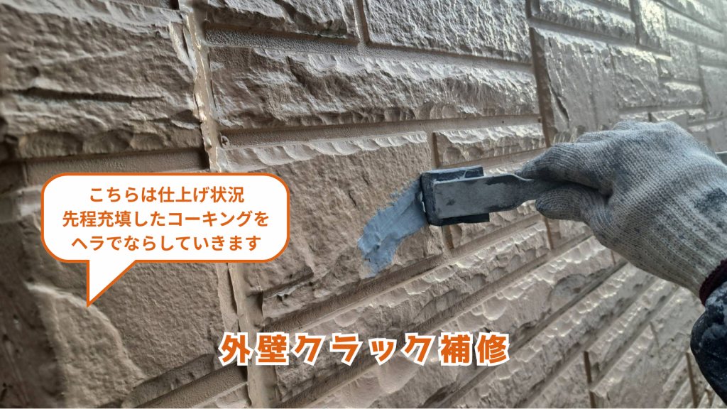 今回の現場では、まずは外壁をしっかり清掃し、ヒビの状態を丁寧にチェック。その後、微細なヒビにも追従できるコーキング材を使い、表面をなじませるように補修していきます。