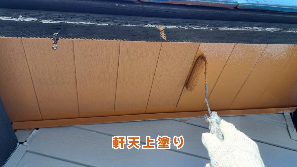 2026/2/17 まずはしっかり清掃を行い、ホコリ等の汚れをキレイに除去。下地の状態を確認してから、軒天専用の塗料で丁寧に塗装していきます。