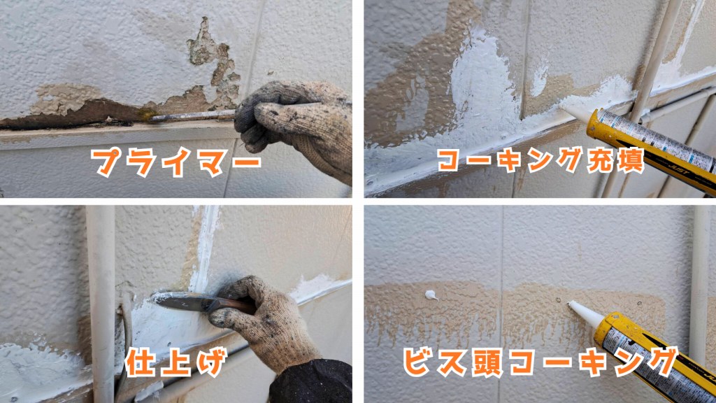 2026/1/14 下地が滑らかになるようプライマーを塗り込み、劣化部分を均一に整えていきます。金ベラを使って外壁の凹凸を埋めるようにコーキングを打ち、表面をならしていく作業です。この工程で外壁の傷みを補い、「新しい塗膜がしっかり密着できる健康な外壁」に整えていきます。