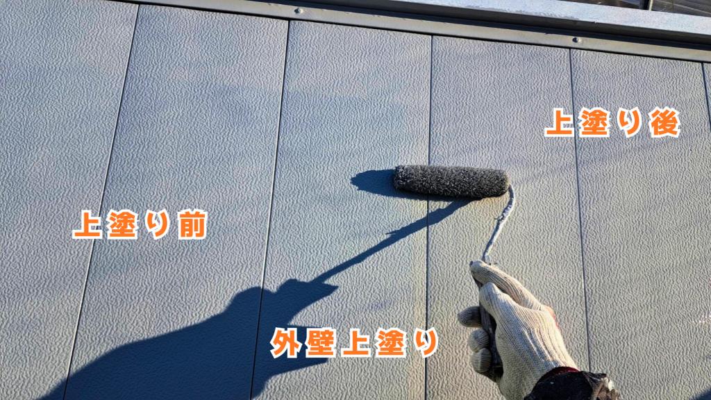 2026/1/22 上塗り作業では、中塗りがしっかり乾燥していることを確認したうえで施工を行います。乾燥状態を見極めながら、ローラーや刷毛を使い分け、外壁全体をムラなく均一に塗り上げていきます。塗り重ねることで色に深みとツヤが増し、建物全体が引き締まった印象に仕上がります。