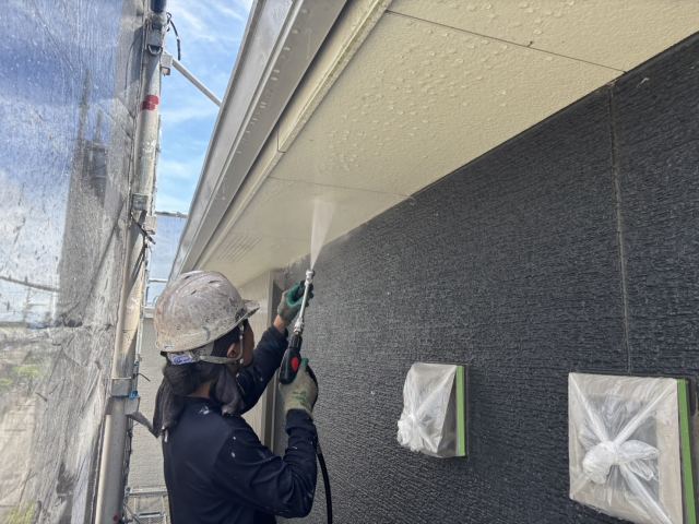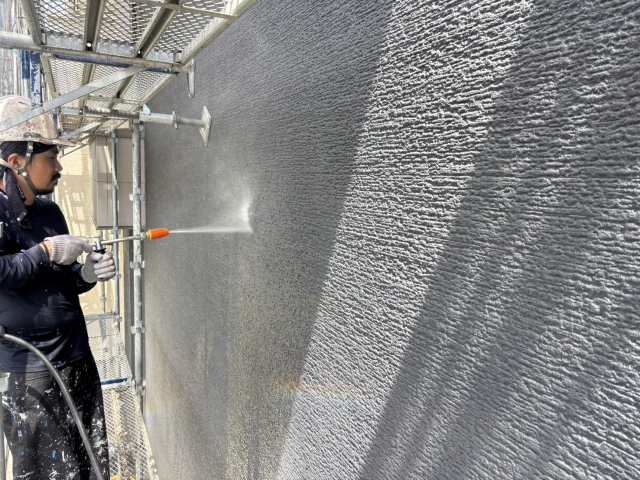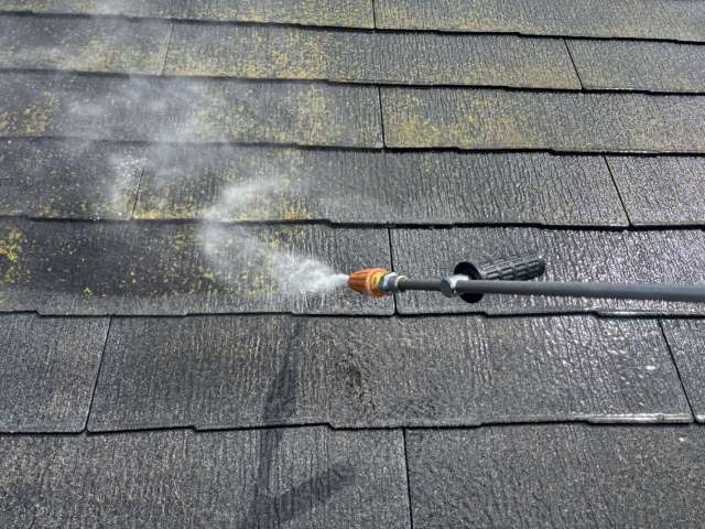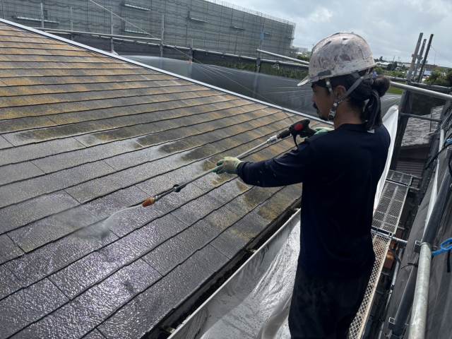 2025/8/1 足場も組み終わり、まず最初に高圧洗浄を行います。屋根の塗装面にこびりついた汚れやカビ、チョーキング(外壁等を触ると手に付く白い粉の現象)を高圧の水流によって洗い落としていきます。何故、高圧洗浄を行うかと言いますとお化粧の前の洗顔と同じで、表面の汚れを落とし、サッパリとしてから塗料を手塗りで塗っていきます。愛情ペイントでは、高圧洗浄の工程は必須作業となります。