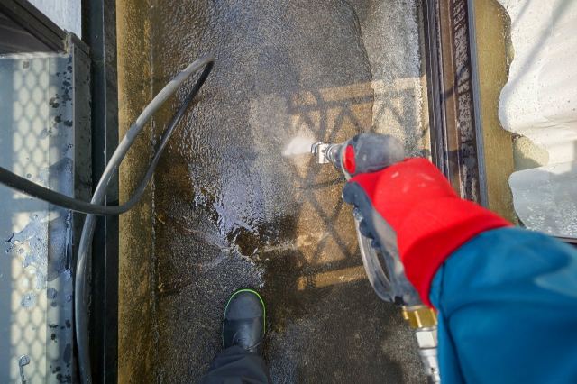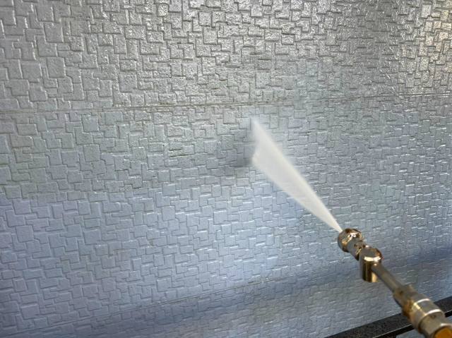 2025/8/22 足場も組み終わり、まず最初に高圧洗浄を行います。屋根の塗装面にこびりついた汚れやカビ、チョーキング(外壁等を触ると手に付く白い粉の現象)を高圧の水流によって洗い落としていきます。何故、高圧洗浄を行うかと言いますとお化粧の前の洗顔と同じで、表面の汚れを落とし、サッパリとしてから塗料を手塗りで塗っていきます。愛情ペイントでは、高圧洗浄の工程は必須作業となります。