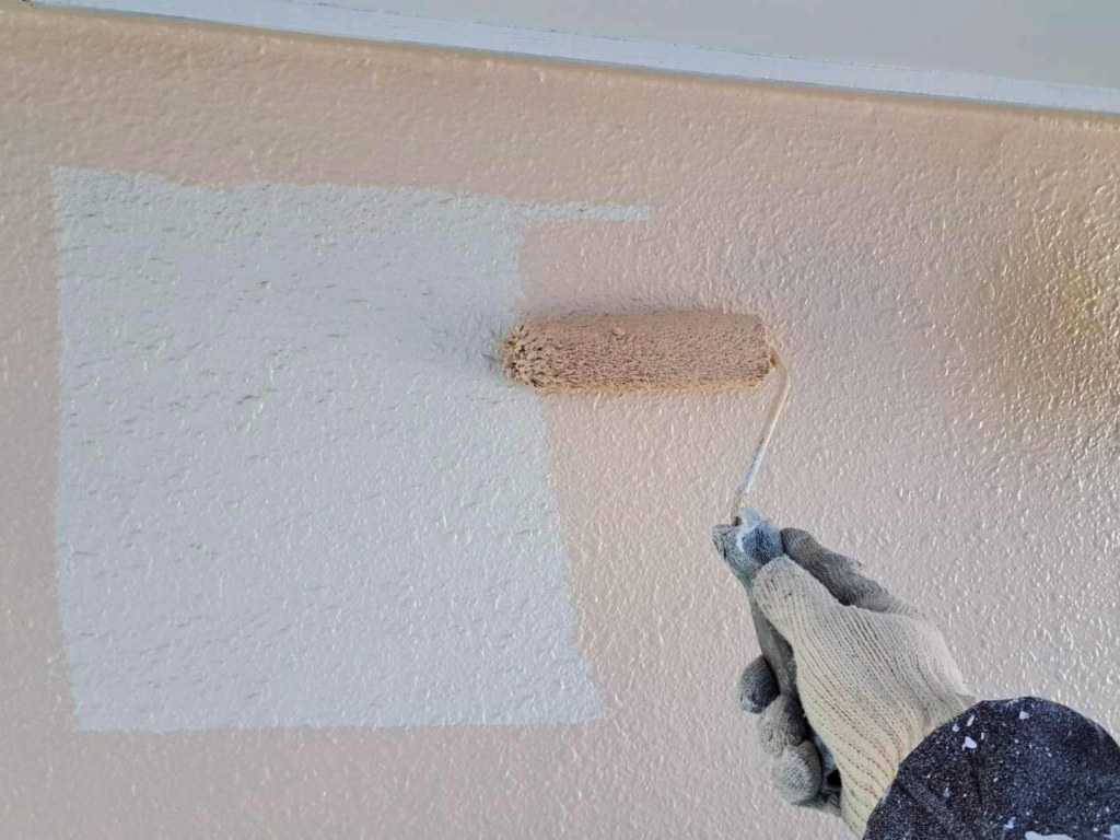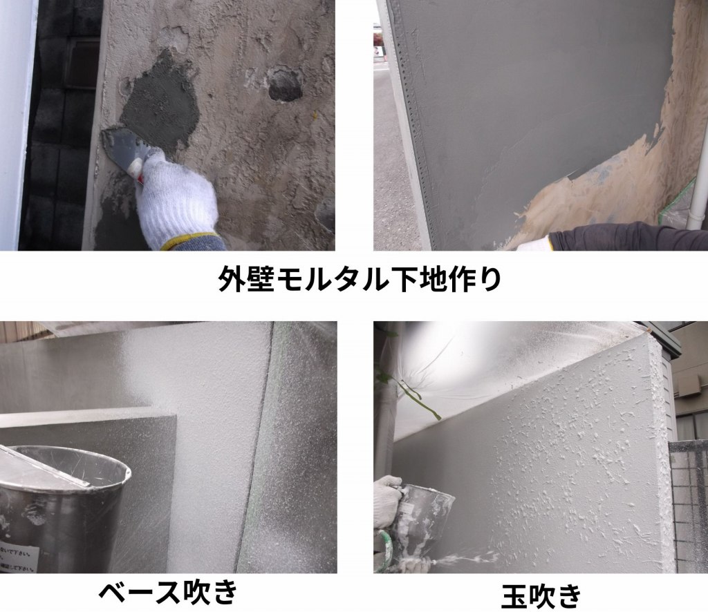 まず、剥がれかけている部分の塗膜を除去します。次に下地調整材としてカチオン系樹脂入りモルタルを使用し、剥がれた箇所をコテで補修していきます。その後、シーラーを塗布し吹き付けを行っていきます。塗装する際は、スプレーガンを使って壁に吹き付けます。骨材を使っているため表面がデコボコで、ザラザラとした手触りに仕上がるのが特徴です。