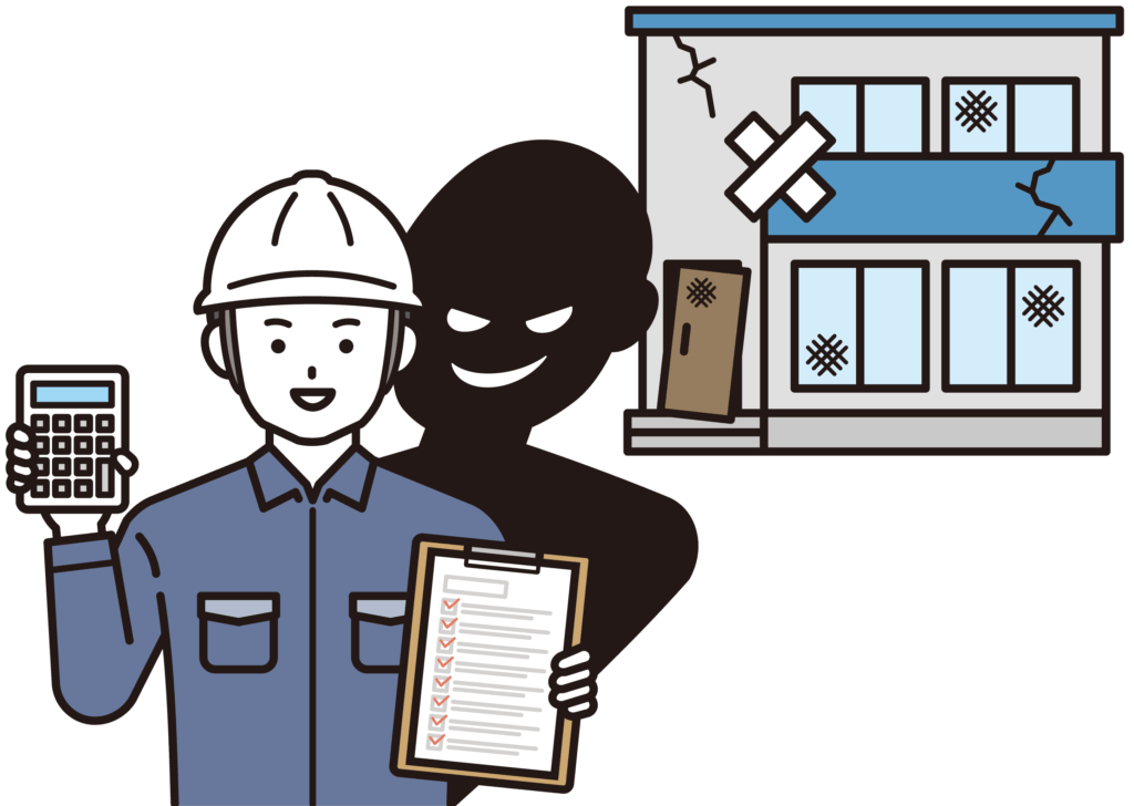 嘘の見積りを提示して法外な金額で契約をさせたり、必要のない無意味な工事を契約させる、また工事の放棄や失踪などがあります。高齢者を狙い資産を騙し取るなど、巧みな話術で契約を勧めてきます。