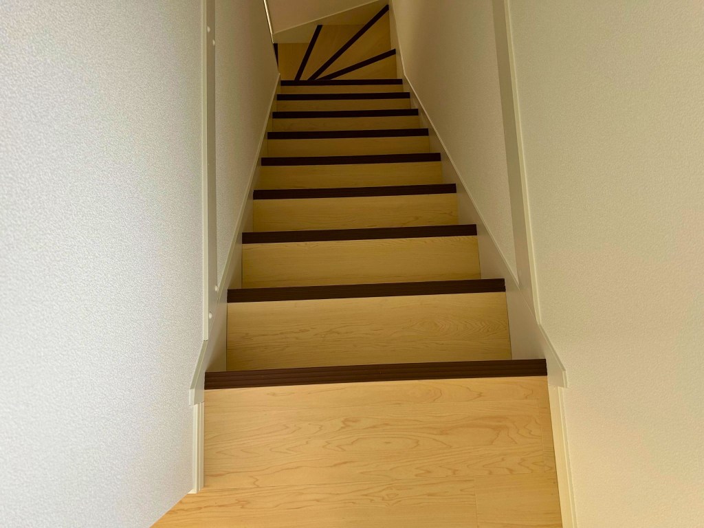 既存住宅リノベーション工事 階段室リフォームを行いました。施工内容は、天井壁クロス貼替、階段フロアタイル貼り、ノンスリップ取付(滑り止め)、照明器具交換、照明スイッチ交換等を行いました。