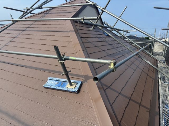下塗りで整えた屋根に中塗りを行いました。中塗りは発色を整えるだけでなく、塗膜の厚みを確保して屋根の耐久性を高める役割があります。中塗りは上塗り塗料が美しい仕上がりになるための土台となるので、こちらの屋根塗料を均一に塗装して紫外線や雨に強い仕上がりとなります。