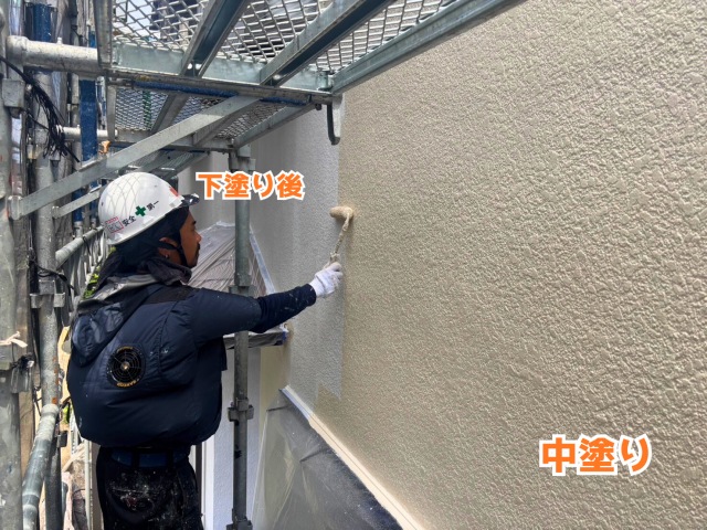 外壁の中塗りは、下塗りと上塗りの中間に塗り付ける層のことで強度と耐久性の向上の為に塗るものです。色は、服部さまがお選び頂いたベージュ色を塗布させて頂いております!これにより、色合いがキレイに整い、塗膜が厚くなることで、さらに外壁の保護力が高まりました。