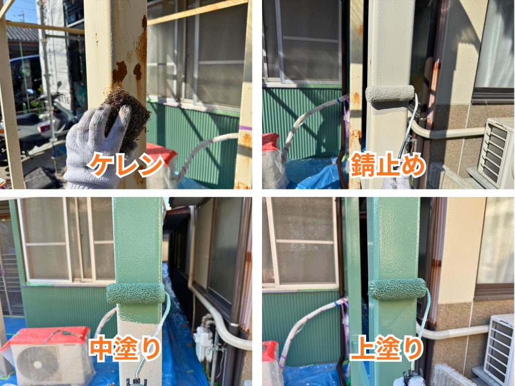 鉄骨部分はサビが発生していたため、まずはケレン作業で劣化した部分や汚れを落とし、下地を整えました。その後、錆止めをしっかり施工し、中塗り・上塗りで塗膜を重ねることで、鉄部を保護しながら美しく仕上げました。見た目の回復だけでなく、今後のサビの進行を抑える大切な工事となっています。