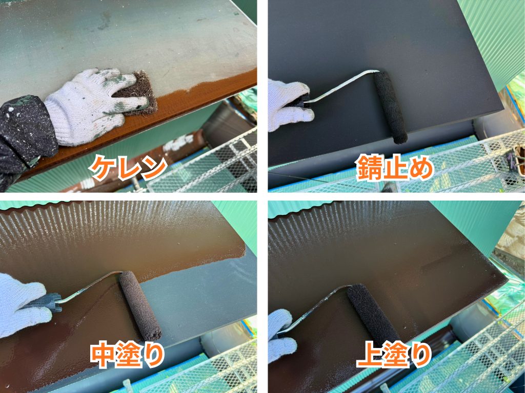 庇は雨を受けやすく、サビや塗膜の劣化が進行しやすい部分です。施工前にしっかりとケレンを行い、錆止めで下地を保護してから中塗り・上塗りを重ねました。塗膜に厚みを持たせることで、防水性と耐久性を高め、見た目も落ち着いた美しい仕上がりになりました。