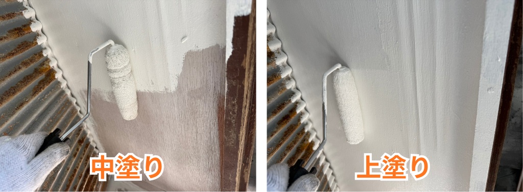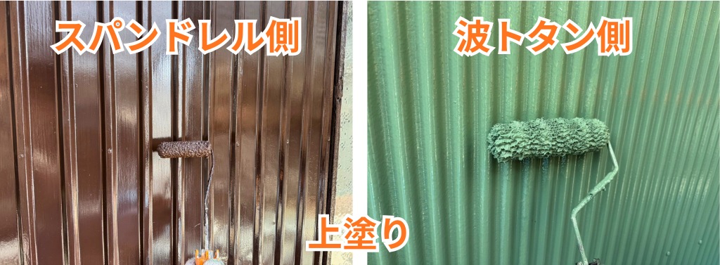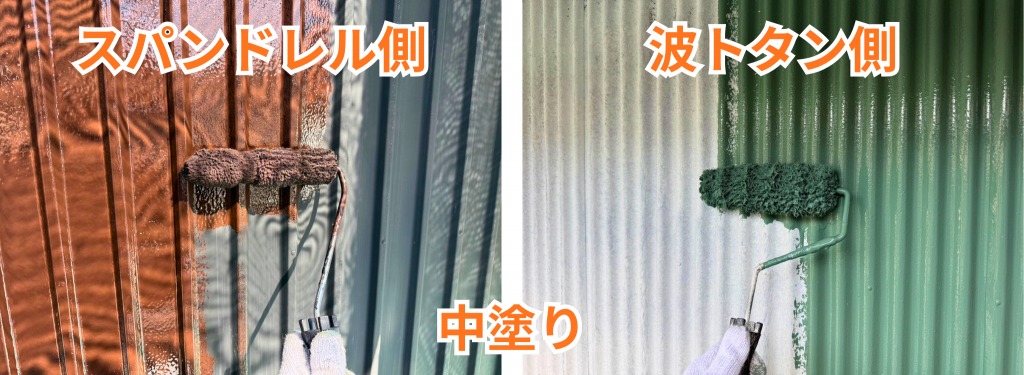中塗りでは、仕上げ色をしっかりと付けながら、塗膜に厚みを持たせていきます。スパンドレル側と波トタン側それぞれに丁寧に塗料をのせることで、色ムラのない均一な仕上がりへと近づけていきました。見た目の美しさだけでなく、外壁を保護する役割も高める工程です。
