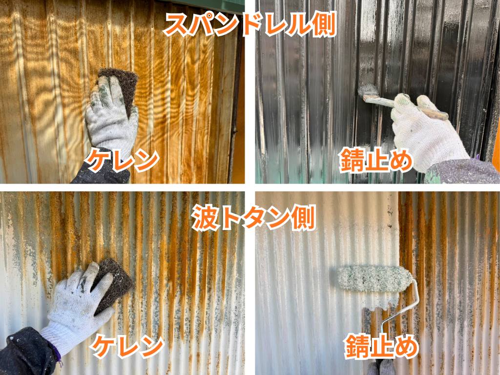 外壁の下塗りでは、傷んだ下地を整えながら、上塗り材との密着を高めるための重要な工程を行いました。特に波トタン面やスパンドレル面は素材に合わせて丁寧に塗り進め、塗料がしっかり密着する土台をつくりました。仕上がりの美しさと耐久性を左右する大切な工程です。