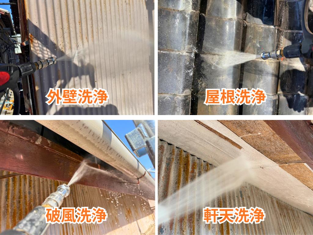 塗装前には高圧洗浄を行い、外壁・屋根・破風・軒天に付着した汚れやホコリ、古い塗膜の浮きなどをしっかり洗い流しました。下地に汚れが残ったままでは塗料の密着が悪くなるため、長持ちする塗装には欠かせない大切な工程です。細かな部分まで丁寧に洗浄し、塗装しやすい状態を整えました。