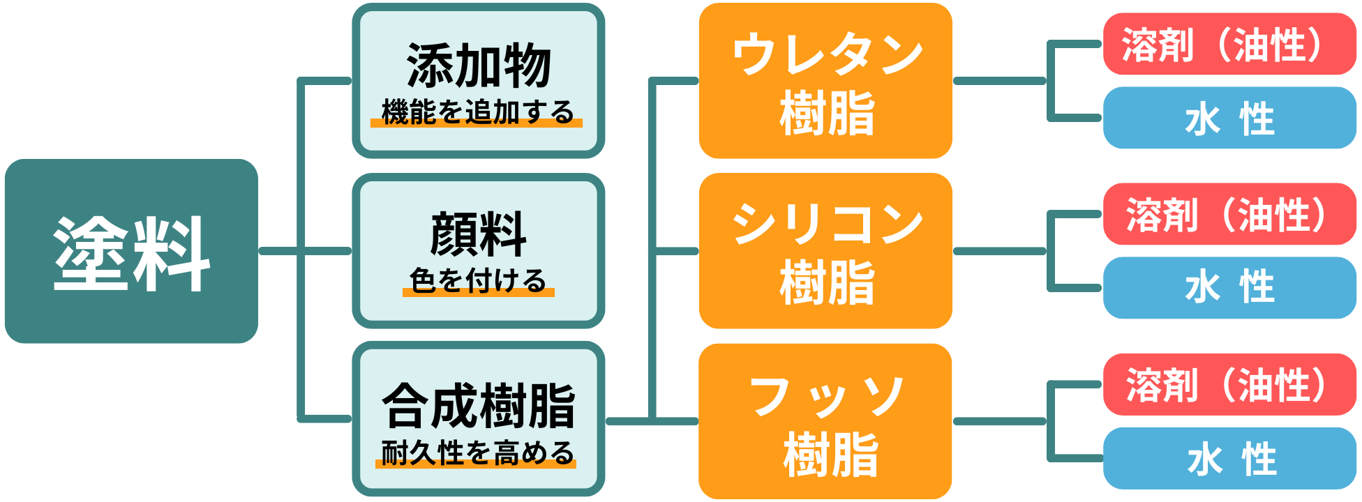塗料は、色を付ける役割の「顔料」や耐久性を高める役割の「合成樹脂」、塗料に機能を持たせる役割の「添加剤」を混ぜて作られます。しかし、これだけでは粘度が高すぎるため、そのままでは外壁や屋根に塗装することはできません。