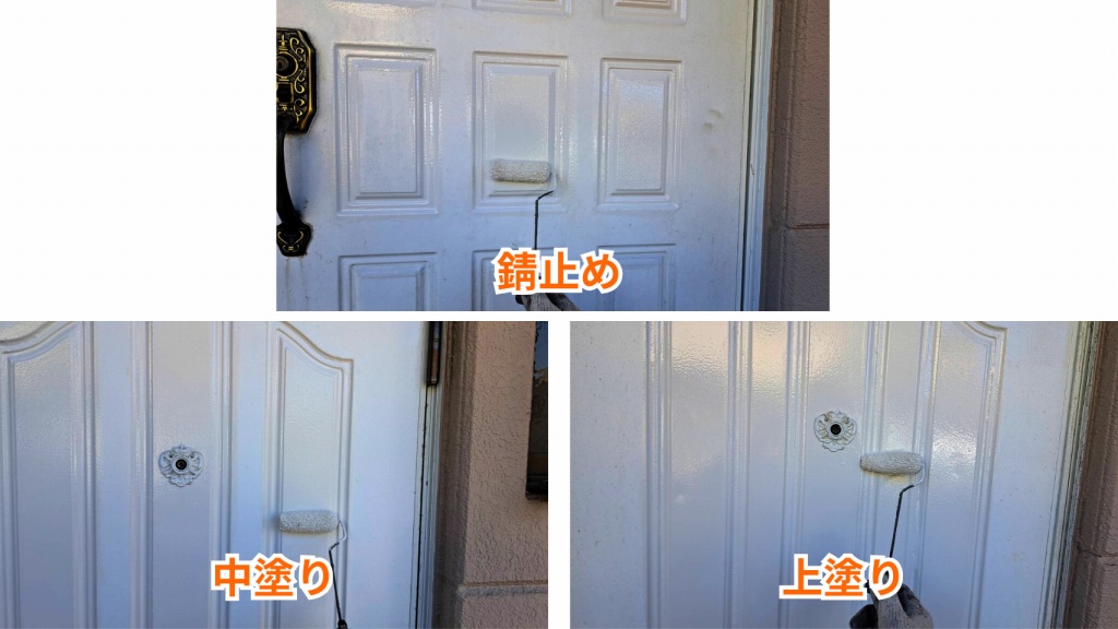 その後、ローラーを使って全体を塗装し、ムラのない仕上がりを目指して作業を進めます。玄関ドアはお住まいの“顔”ともいえる部分ですので、ただ色をのせるだけではなく、艶感や均一な美しさにもこだわりながら仕上げていきました。