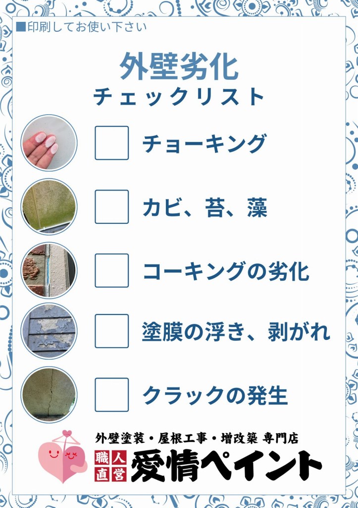 こちらは、愛情ペイントの外壁劣化チェックリストになります。こちらをクリックし、印刷して頂きご自宅の外壁を一度チェックしてみましょう。