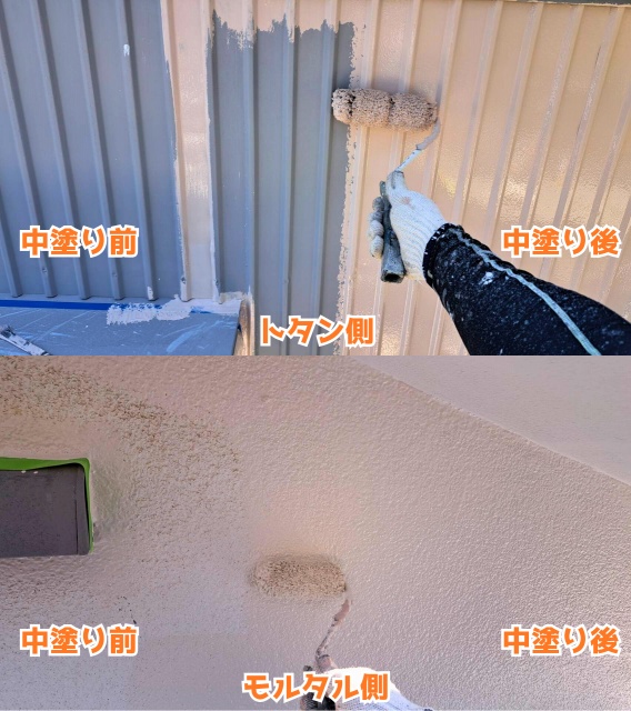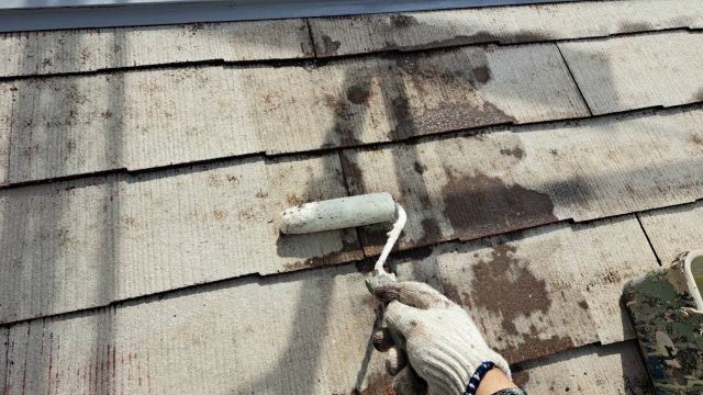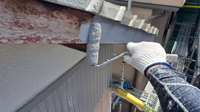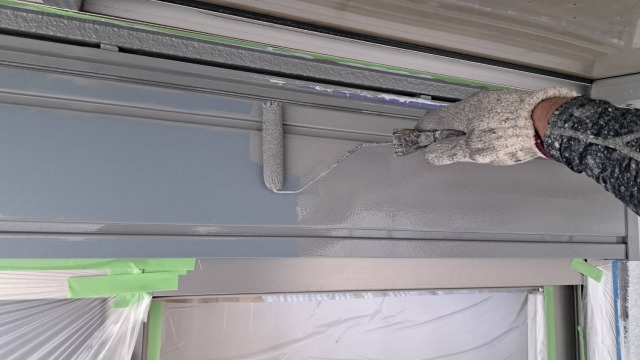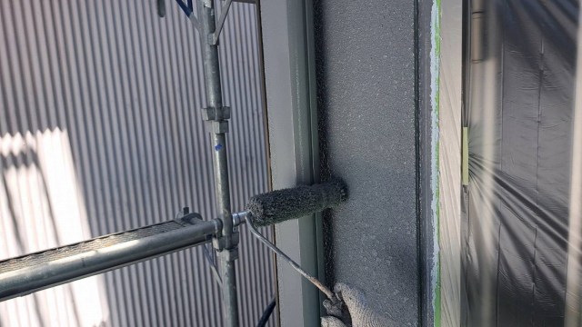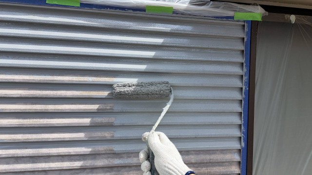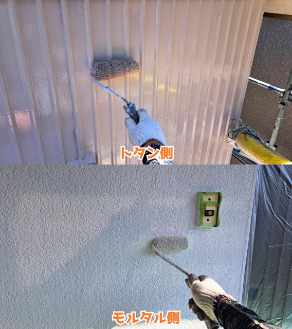 外壁塗装の最初の工程は下塗りです。トタン側には錆止めを使用し、モルタルにはシーラーを塗布していきます。下地をしっかり整えてから次の工程へ進みます。シーラーは塗膜と外壁をしっかり密着させる役割があり、この工程を丁寧に行うことで塗料の耐久性が大きく変わります。
