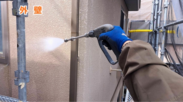 塗装の前に欠かせないのが「高圧洗浄」です。屋根や外壁にこびりついた汚れ・カビ・チョーキング等を工事業者専用の高圧洗浄機を使用し、強い圧力の水でしっかり落とします。これは、いわゆる「お化粧前の洗顔のようなもの」。下地をキレイにすることで、これから塗っていく塗料が長持ちし、仕上がりも美しくなります。