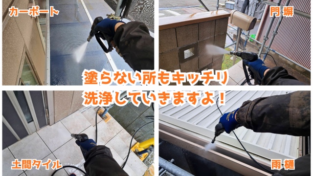 屋根、外壁の高圧洗浄を行います。塗装は化粧に例えると「洗顔」のようなもの。旧塗膜や錆、チョーキング等をキレイに落としてからでないと、塗料の密着が悪く、ムラが出て見た目が悪くなってしまい、仕上がりや耐久性に影響します。施工した後に見えてくることになりますが、仕上がりを左右する大切な工程です。