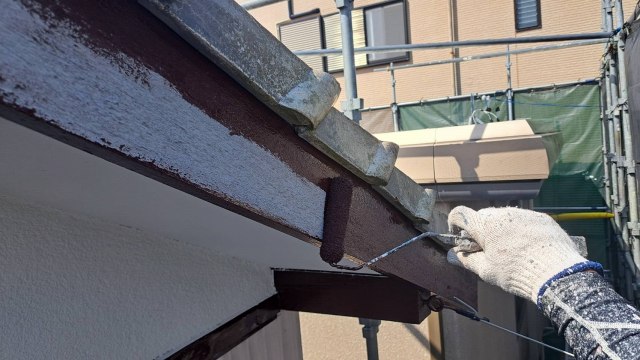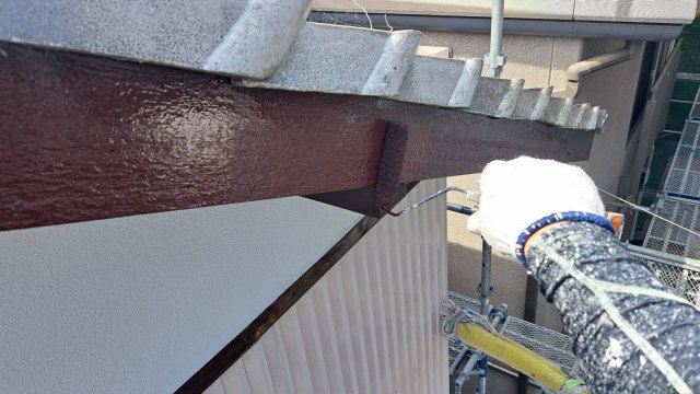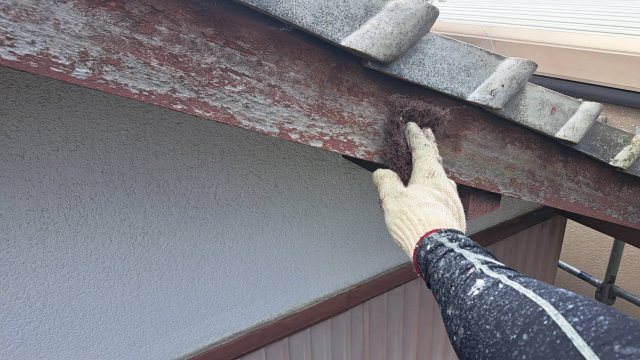 あまり馴染みが無いかも知れませんが屋根の端にある破風板は、紫外線や雨風の影響を大きく受ける部分です。破風塗装では、まずケレンで旧塗膜を除去して下地を整え、錆止めを塗布。その後、中塗り・上塗りでしっかり仕上げます。外壁や雨樋と色を合わせることで、見た目にも統一感が出て、お住まいがぐっと引き締まります。