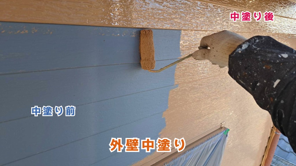 中塗りでは、仕上げ塗料を一度目に塗布。色味がはっきりと現れ始め、外観の印象が大きく変わってきます。塗膜に厚みを持たせることで、防水性・耐候性を高めていきます。