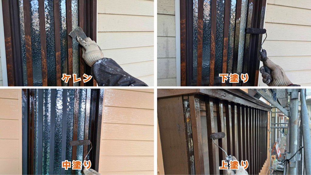 まずはケレン作業で旧塗膜の浮きや汚れを除去します。表面を整え、塗料がしっかり密着する下地を作ります。木部専用の下塗り材を塗布し、吸い込みを抑えます。塗膜の密着性を高める大切な工程です。仕上げ塗料を一度目に塗布。色が入り、面格子の印象が引き締まってきます。最後に上塗りを行い、艶と耐久性を確保。木部をしっかり保護し、美しく仕上げます。